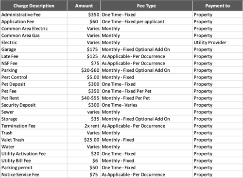 Below is a chart to help you estimate the most common initial and monthly fees and costs that you may incur during the initial term of your lease. These fees and costs may vary depending on the qualifications of the applicant, the price and amenities of the unit being rented, and the unique floorplan’s specifications. The rent, charges, and fee ranges are accurate as of the date noted below but may increase or decrease until you sign your lease. Final security deposit totals may vary based on credit approval and conditional approvals.